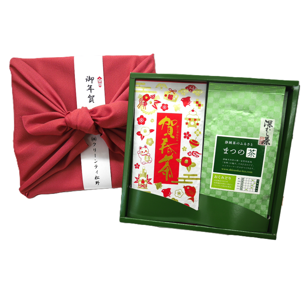 賀春茶と当店人気商品を化粧箱に入れて、風呂敷で包みます。
